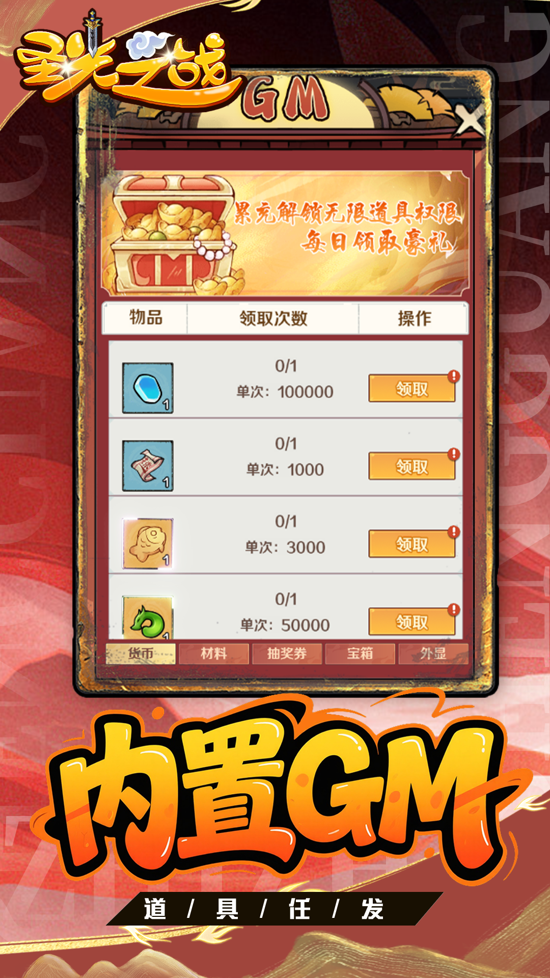1.免费代金:每天登录1w代金券,消耗可激活游戏内GM买断! 2.GM买断:游戏内充值0.1折买断游戏,想要什么自己发!! 3.百万充值:海量充值卡每天登录即可领取,还可双倍领取根本花不完! 4.买断礼包:购买即得返代金券,神品外观,代金券天天免费领取!